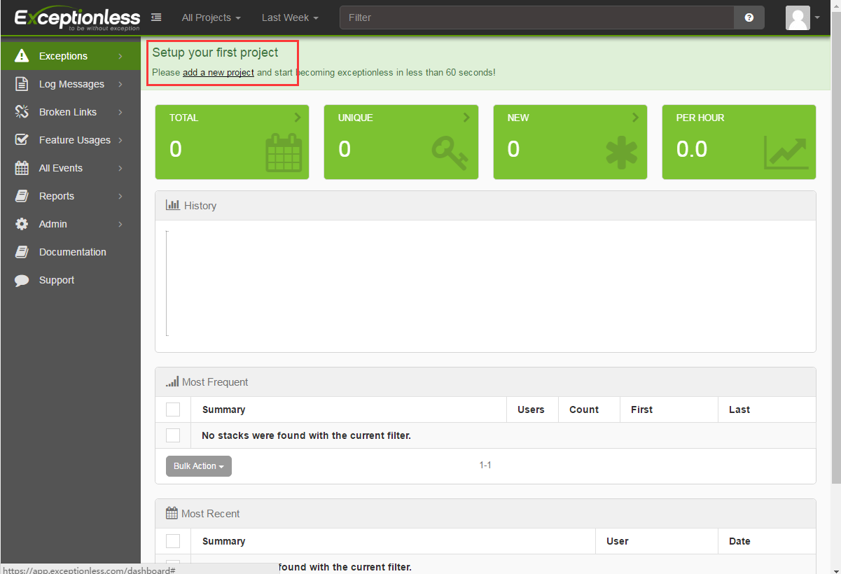至此,Exceptionless 已经可以在你的项目中工作了,它会自动记录项目中的异常情况。