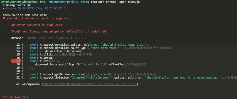 这个测试做的工作为打开github,期望github的搜索框存在,输入框输入testcafe,点击回车,期望搜索列表搜索结果多于10条,点击第一条结果,期望跳转的页面中存在返回的内容。