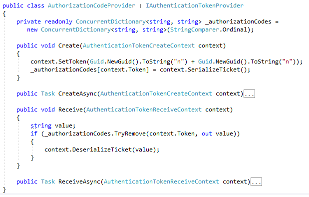 从上面代码可以看出这个提供器的核心功能是以Guid的方式生成一个键值(授权码)保存了当前用户的信息,当解析时通过该键值(即授权码)获取用户身份信息。(注:AuthenticationTokenCreateContext对象用于对当前用户身份信息AuthenticationTicket对的的序列化和反序列化)