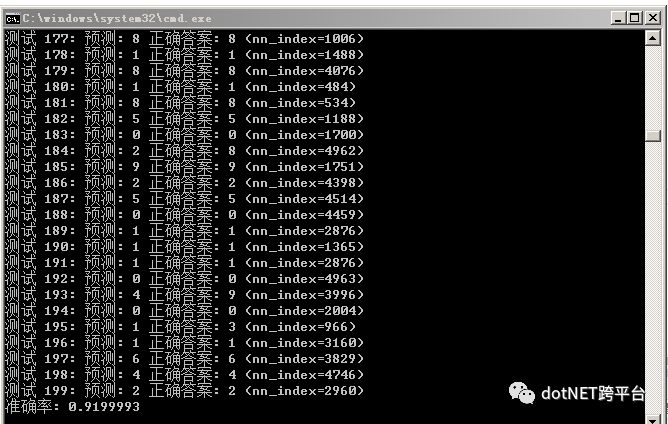通过多次拿图片,我们就可以获得一个准确率(获胜的次数/拿图片的总次数)。最后程序的输出如下: