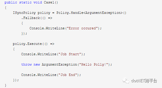 执行结果如下图所示:这里捕捉的是ArgumentException, 如果想捕捉所有的Exception,请设置Policy.Handle<Exception>,不过这样就扩大了范围。