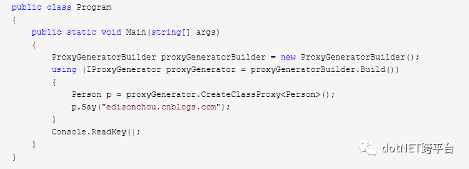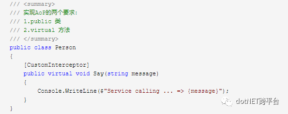 可以看到我们在要拦截的方法Say()的声明之上加了一个Attribute:CustomInterceptor,正是我们之前新增的。