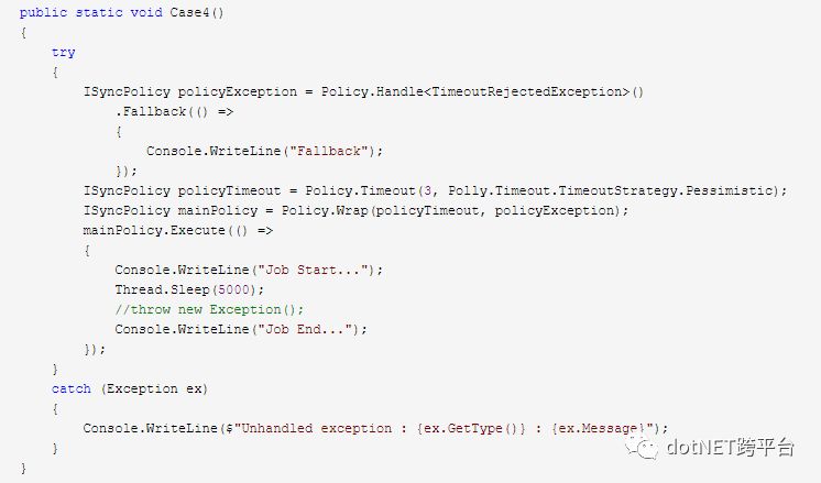 (5)Timeout 与 Wrap => Wrap是指策略封装,可以把多个ISyncPolicy合并到一起执行。Timeout则是指超时处理,但是超时策略一般不能直接使用,而是其其他策略封装到一起使用。
