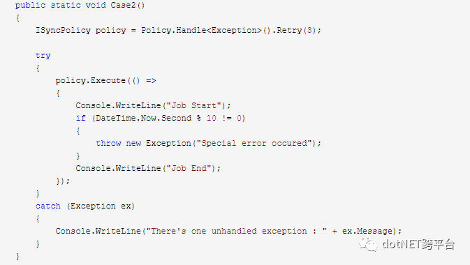 执行结果如下图所示:可以看到,这里重试了三次,仍然没有满足条件(DateTime.Now.Second % 10 == 0),因此进入了外部的未处理异常catch块中。