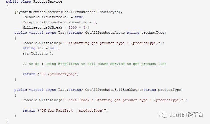 为了能够在控制台中看到熔断的信息,我们增加一句Console.WriteLine到HystrixCommandAttribute中: