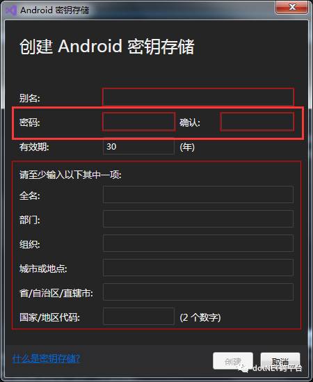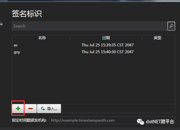 点击+号,创建证书.并填写如下图的信息,请牢记你这里输入的密码.
