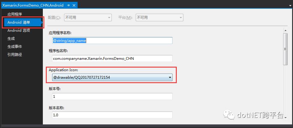 在Application Icon选项中,我们可以任意选择一个已有的图片资源文件,并设置为应用程序的图标.