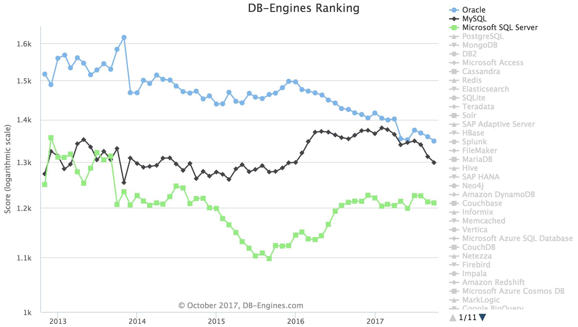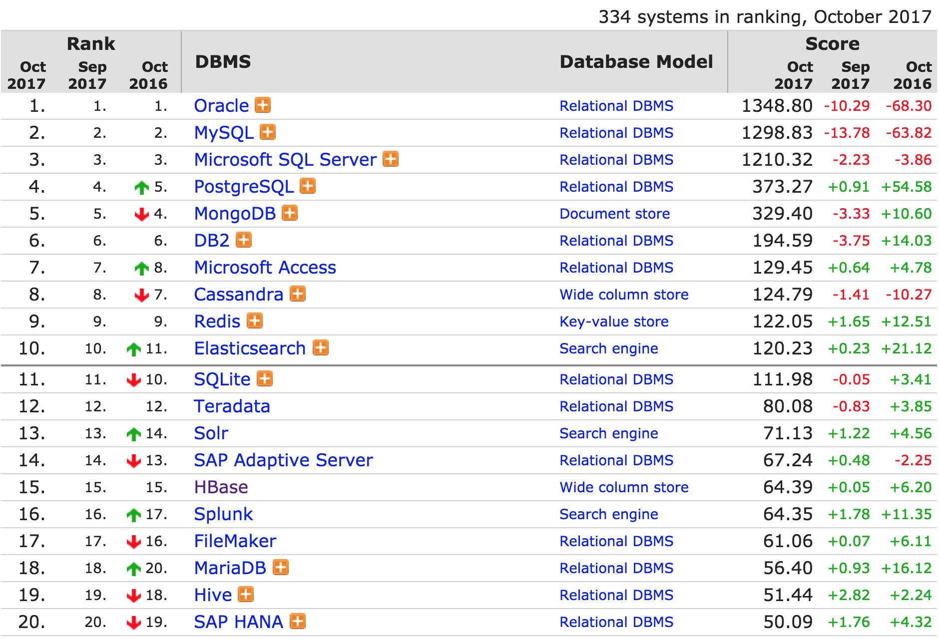 全球数据库排名:MySQL 三连跌,PostgreSQL 最稳,DB-Engines 发布了 2017 年 10 月份的数据库排名,本月排名前 20 名的数据库排名均没有变化。