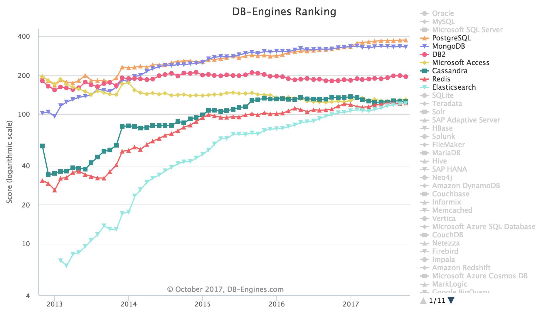 详细趋势请看这里:http://db-engines.com/en/ranking_trend