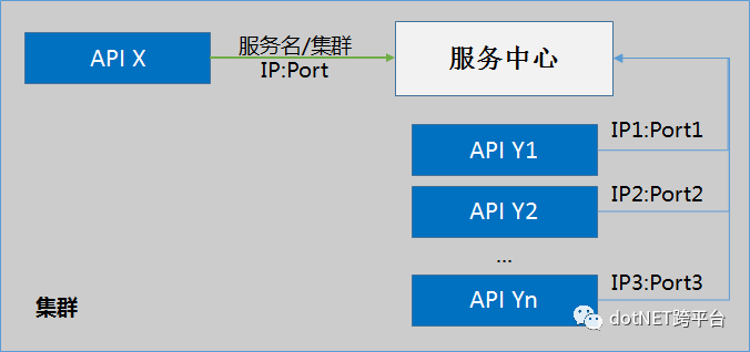API X/Y/Z/...注册到服务中心(蓝色箭头);