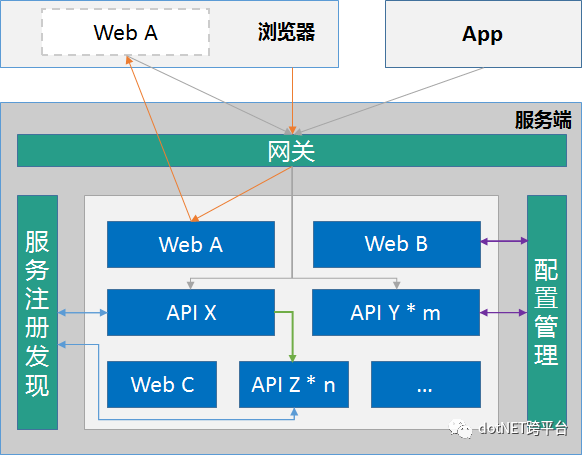 Web通过url或ajax经过网关访问服务端API,App通过类Http Client方式经过网关访问服务端API(灰色箭头);