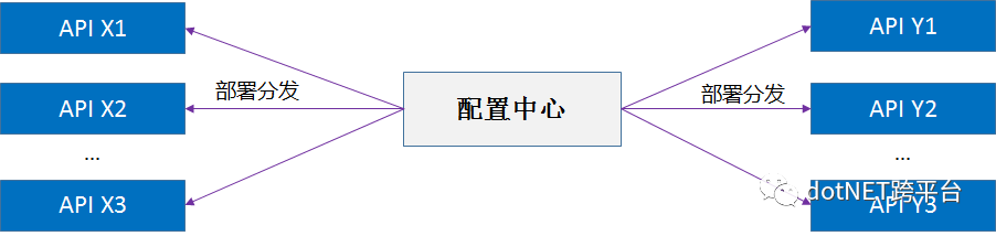Web A/B/C/...、API X/Y/Z/...从配置中心读取各自的配置(紫色箭头);