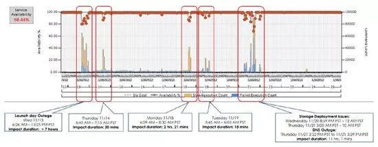 SLA本身并不是我们的目标。我们的目标是100%的满意度。这意味着我们需要执着于可能只占0.001%的异常情况。因为异常情况往往隐藏在平均情况中,为了让SLA的计算更严谨,我们陆续开发了三代算法。这三代算法的具体情况如图16所示。最初我们使用了由外至内的监视(下图中虚线所示)用来追踪服务器的可用性。第二代算法主要关注相对所执行命令的总数,执行缓慢或失败的命令的相对数量,借此找出更普遍的异常情况所对应的问题(下图黄线和蓝线)。随着服务继续完善,“分母”已经排除了大部分不符合要求的客户所对应的情况。目前我们采取的计算方法是计算用户所遇到的服务不可用的分钟数在总使用分钟数中所占的比重,用黑线代表。