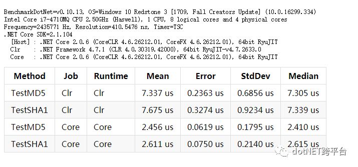 可见在 .net framework 环境下,仍然是 MD5 比 SHA1 快的。而且可以看见 .net core 比 .net framework 环境下快了很多。