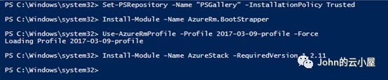 接下来需要通过 API 版本配置文件来安装与 Azure Stack 兼容的 AzureRM 模块。 Azure Stack 需要 2017-03-09-profile API 版本配置文件(可通过安装 AzureRM.Bootstrapper 模块获取),命令如下: