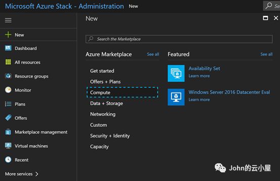 完成后,在登录到管理员界面就可以看到可以创建虚机了。请注意用户名为:cloudadmin@azurestack.local