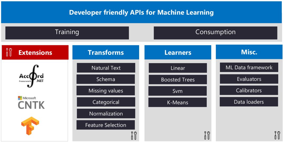 ML.NET首先是一个框架,这意味着它经扩展后可以添加流行的机器学习库,比如TensorFlow、Accord.NET和CNTK。我们致力于将开发ML.NET的内部功能方面的全部经验带给开源界的ML.NET。