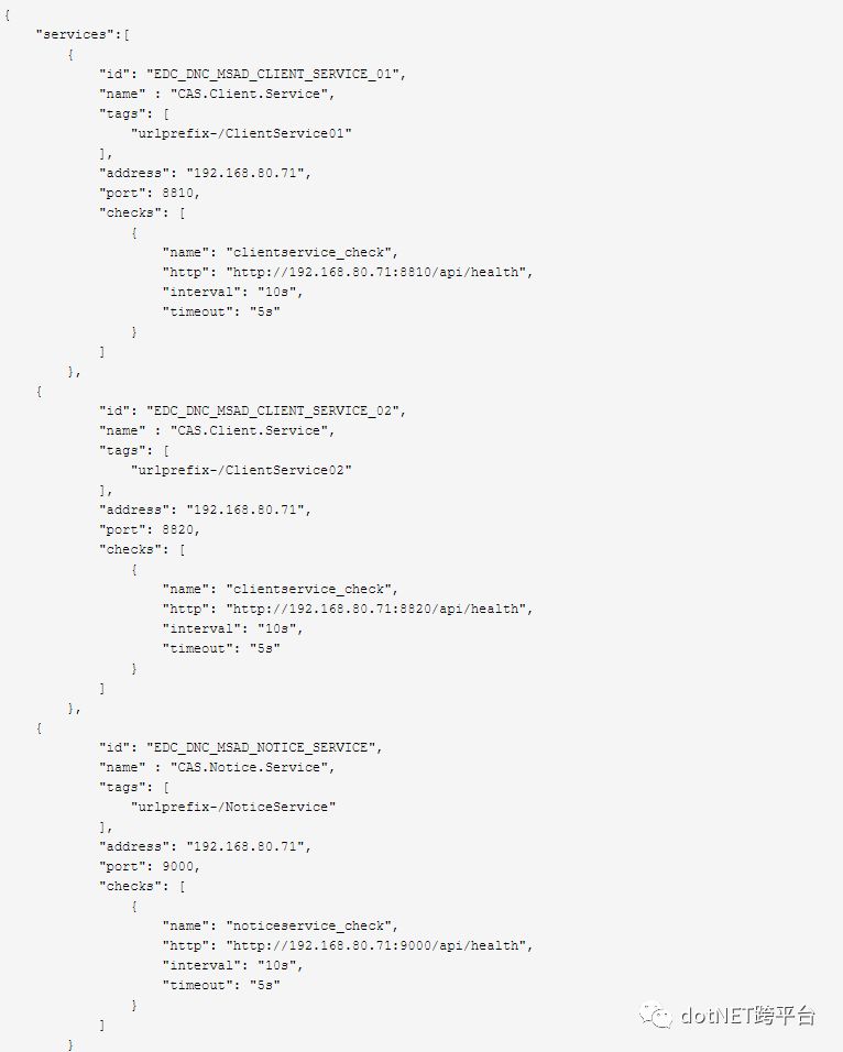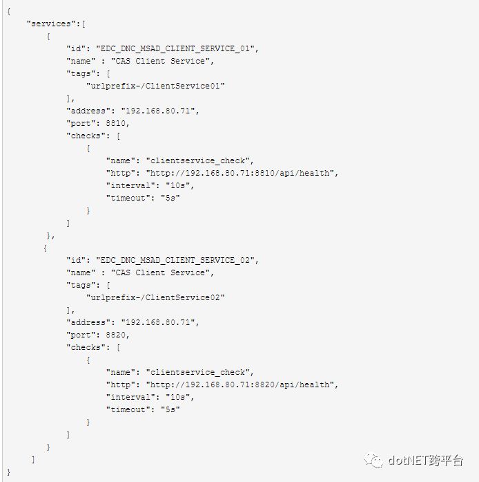 这里我准备了一个如下所示的JSON配置文件(eg.取名为services_config.json),配置了两个服务在里边: