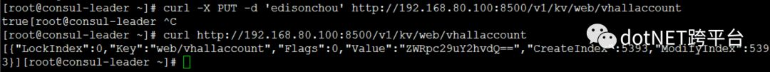 192.168.80.100>curl -X PUT -d 'edisonchou' http://192.168.80.100:8500/v1/kv/web/vhallaccount