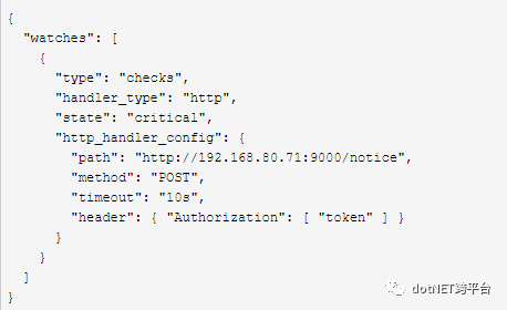 熔断保护在Consul和Ocelot中都有实现,意思就是当一个服务不正常时(比如我们的一个服务实例挂了,Consul的健康检查机制检测到了),应该给系统维护人员给以告警。在Consul中,服务告警也是通过配置文件来实现的。