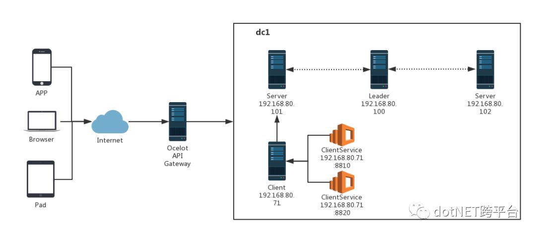 这里我们有三个Consul Server节点,一个Consul Client节点,在Client节点上跑了两个ClientService实例,分别占用8810和8820端口。至于基于Ocelot的API网关服务,还没有实现,留到以后跟各位分享。这里假设我们已经启动了这几个节点,并且能够成功访问这两个ClientService实例(事先把实例启动起来,可以通过IIS,也可以通过命令行启动Kerstel服务器运行)。